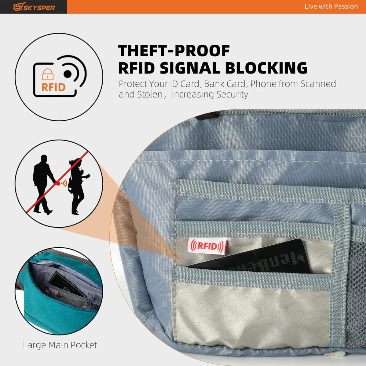 Geanta este prevazuta cu protectie RFID, care blocheaza scanarea neautorizata a cardurilor si iti pastreaza datele in siguranta.