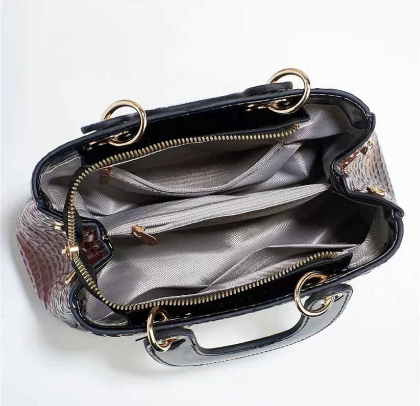 Geanta impresioneaza prin aspectul sau croco lacuit, care adauga un plus de rafinament si originalitate. Pielea ecologica de inalta calitate confera un look luxos, dar ramane rezistenta in timp si usor de intretinut. Textura fina si stralucirea discreta transforma geanta intr-un accesoriu chic, potrivit pentru orice ocazie.