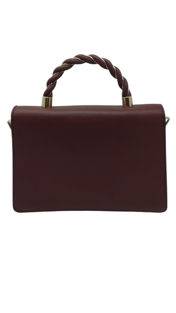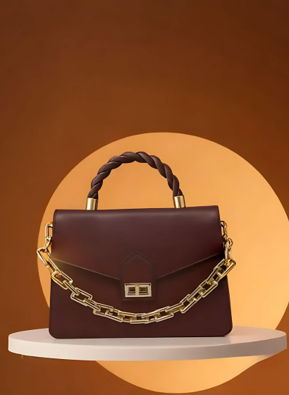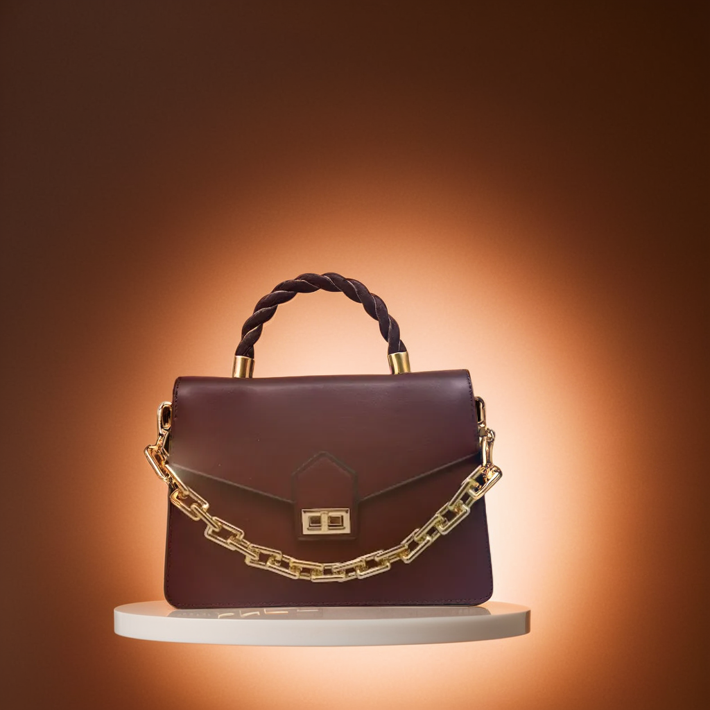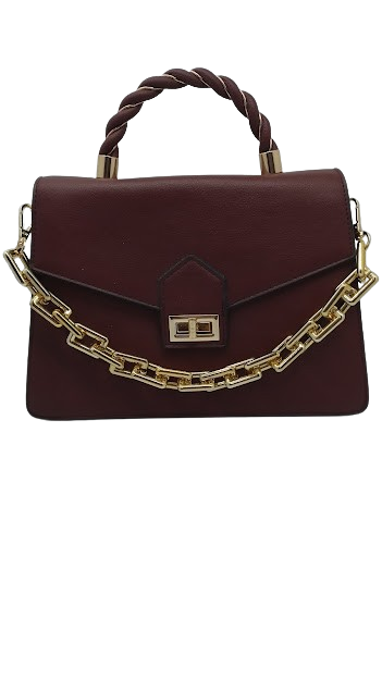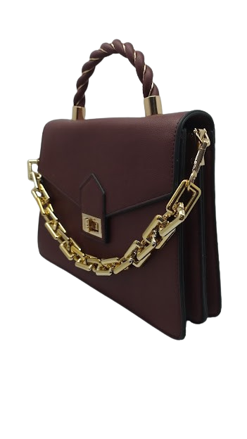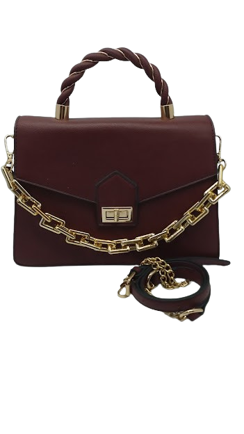 Descoperă eleganța și rafinamentul cu această geantă burgundy, perfectă pentru orice ocazie. Cu un mâner împletit și un lanț auriu decorativ, această geantă adaugă un plus de stil fiecărei ținute.