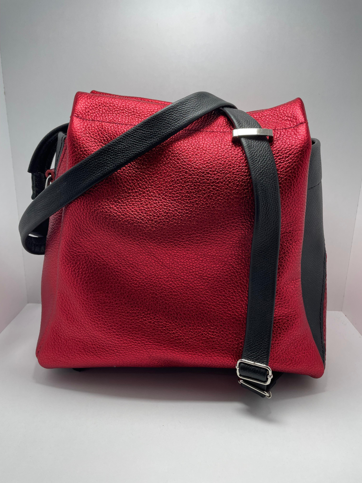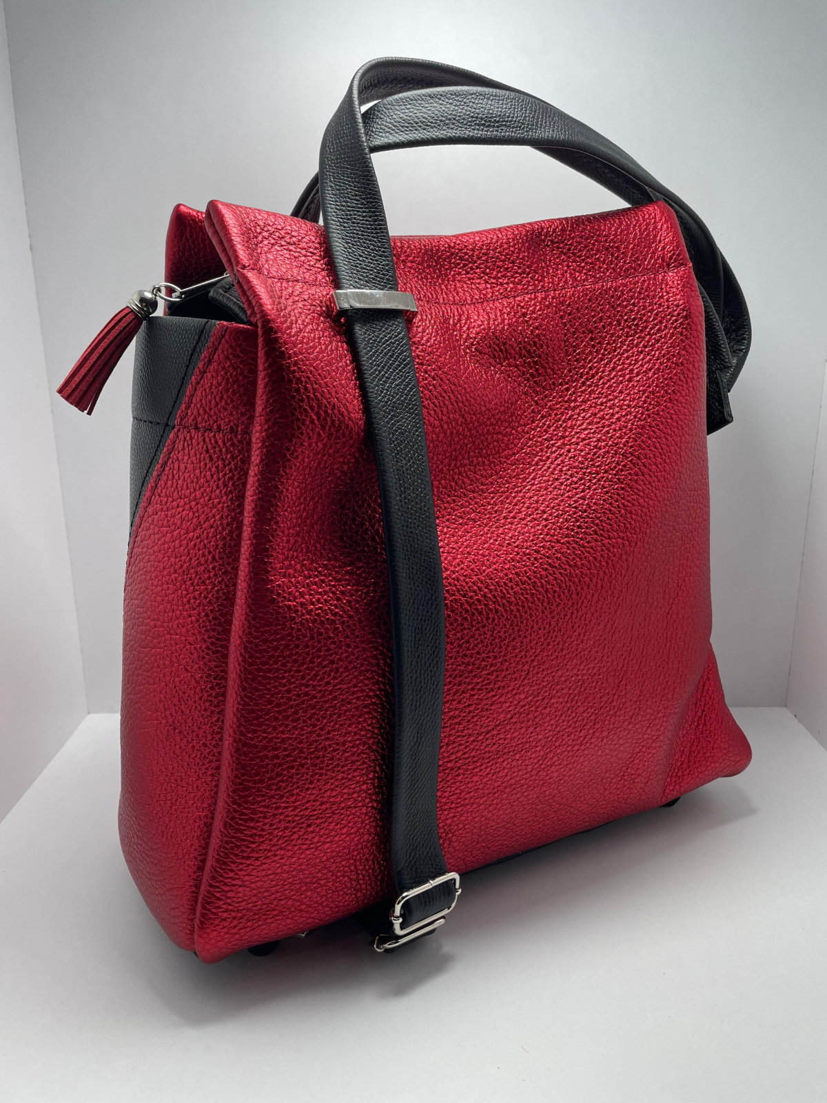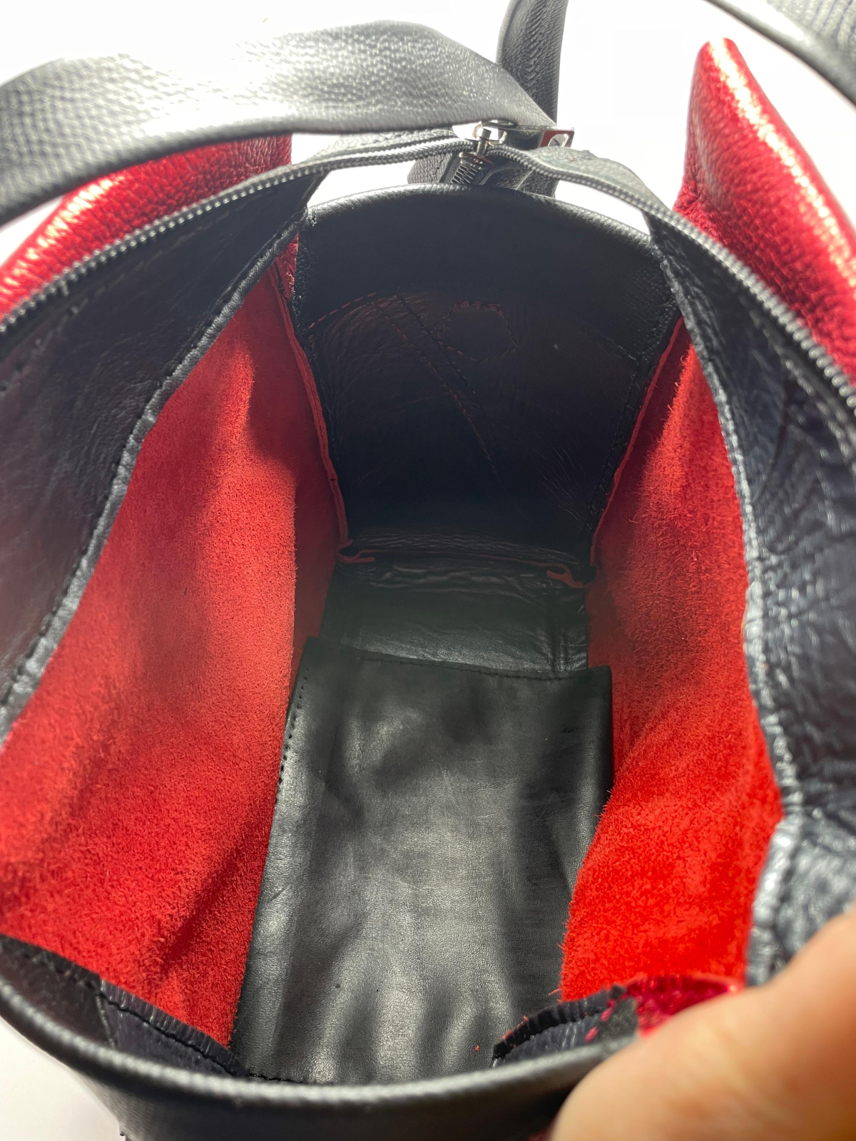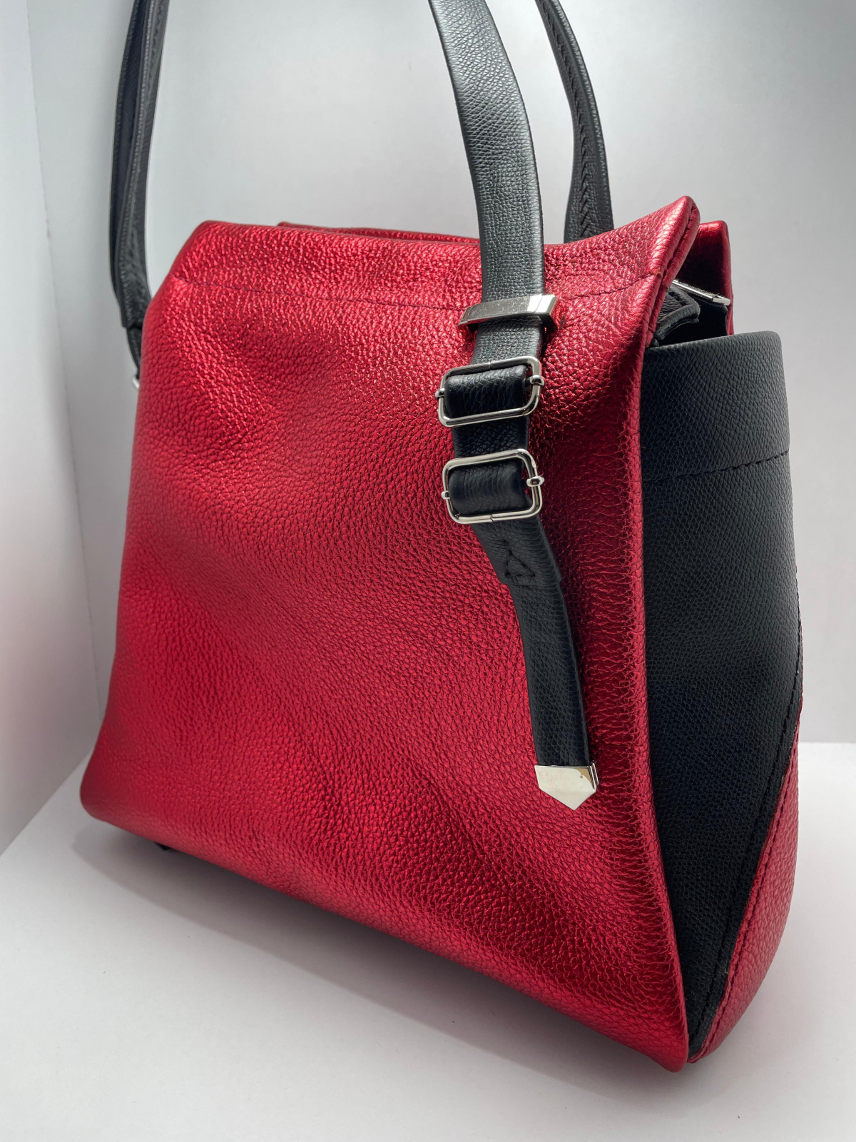 Geanta Roxana Piele Naturala Lucrata Manual - Rosu Metalizat cu Negru – Design casual original, din geanta dama piele naturala, lucrata de Titi Valenti. Compartiment singular, buzunar interior si inchidere sigura cu fermoar.