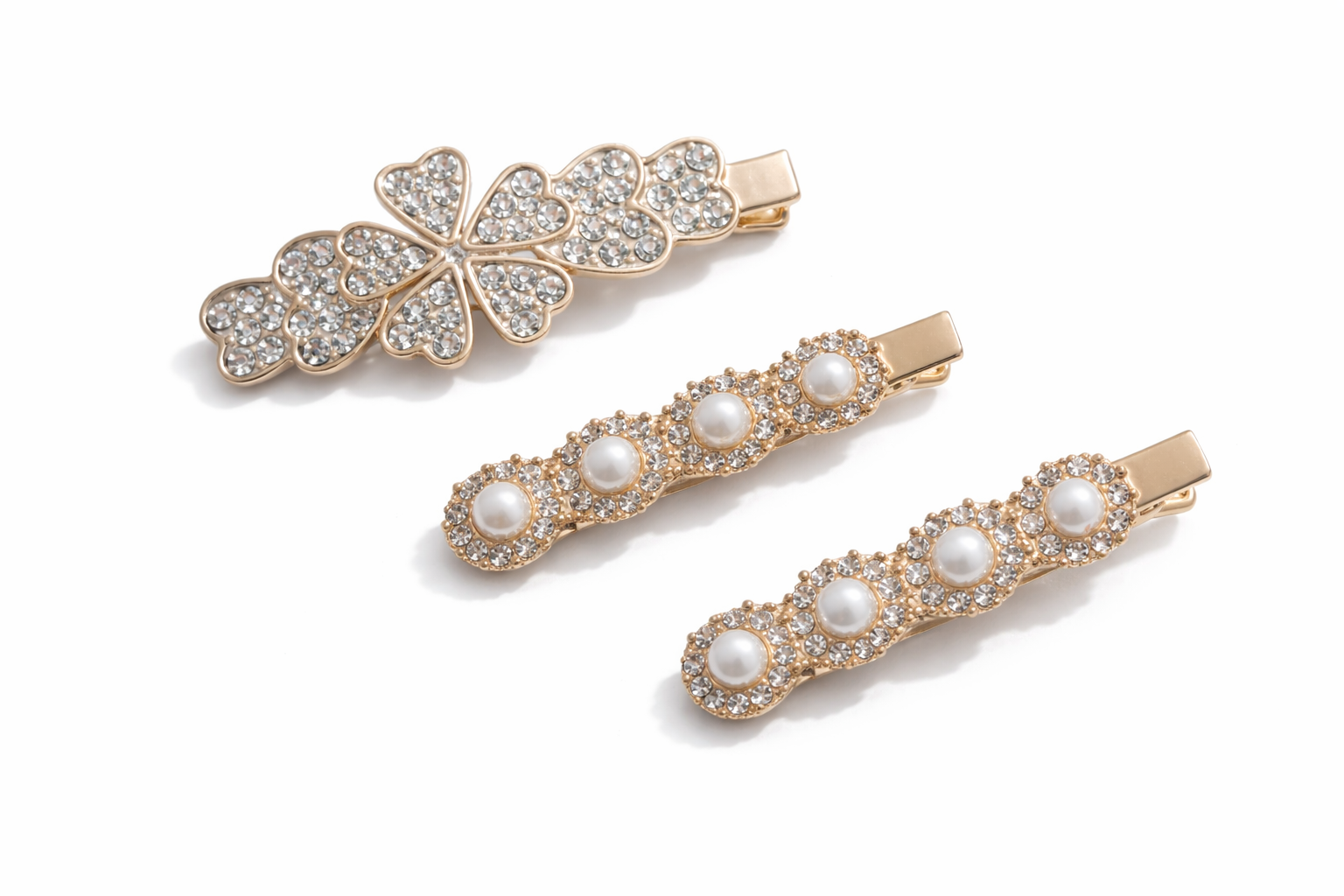 Set 3 Clame de Par Gold cu Perle si Trifoi – Eleganta, Noroc si Stil Feminin