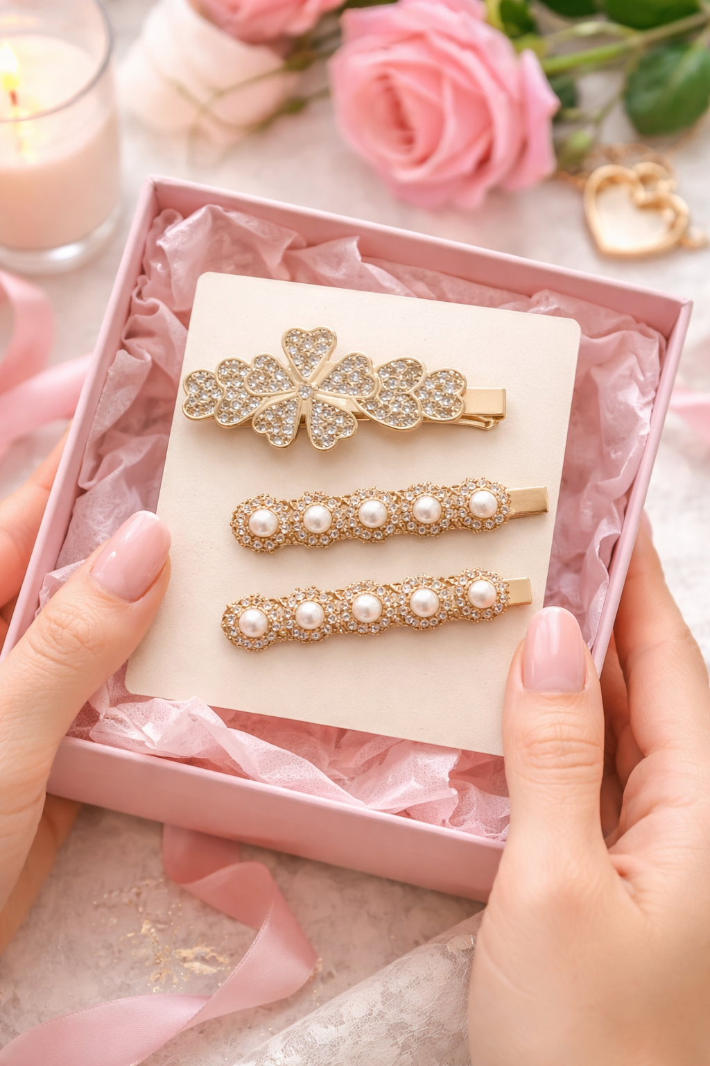 Alege Set 3 Clame de Par Gold cu Perle si Trifoi pentru un look elegant, feminin si plin de simbolism. Un accesoriu care aduce stil si noroc in fiecare zi.
